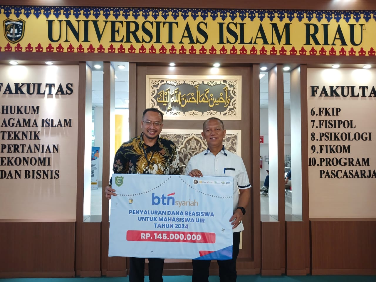 Pekanbaru (Bingkairiau.com) - Universitas Islam Riau (UIR) tidak hanya fokus pada peningkatan akademis tetapi juga membangun jejaring kerjasama dengan berbagai mitra salah satunya dengan BTN Syariah. Melalui BTN Syariah Pekanbaru UIR terima bantuan dana beasiswa untuk mahasiswa sebesar 145 Juta Rupiah. Kegiatan penyaluran dana beasiswa diselenggarakan di Ruang Sidang Gedung Rektorat UIR pada Kamis (18/07/2024).